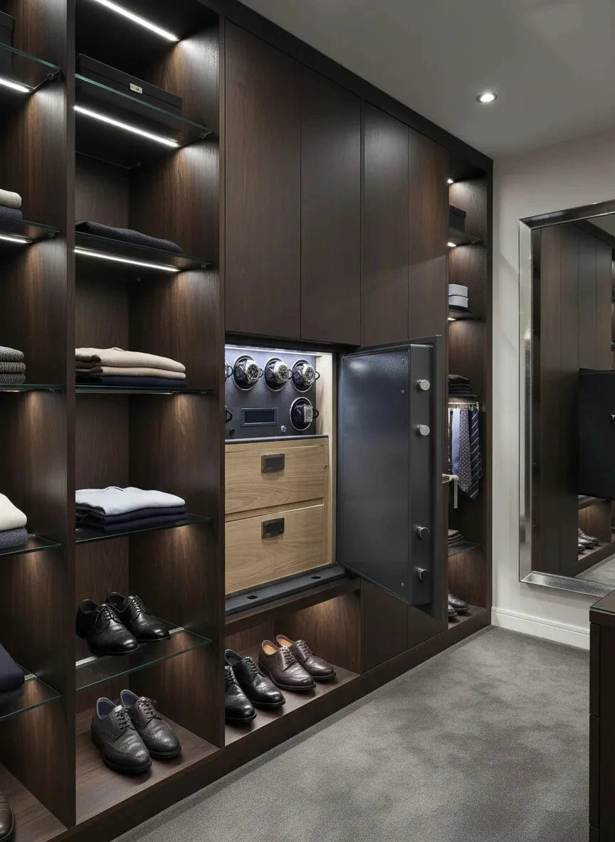 A modern walk-in closet with dark wood shelves holds folded clothes and shoes. Built into the wall, an open Aevitas Grade 3 Watch Winder Safe (£350,000 insurance rated) adds luxury, security, and organized storage to the space.