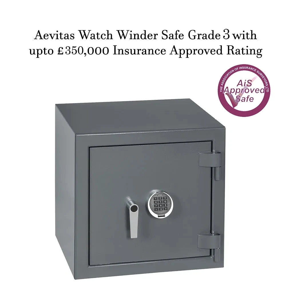 Aevitas Grade 3 Watch Winder Safe—grey, square, with digital keypad and handle. Text: “Grade 3 Watch Winder Safes with £350,000 Insurance Rating by Aevitas.” AIS Approved Safe badge in top right.