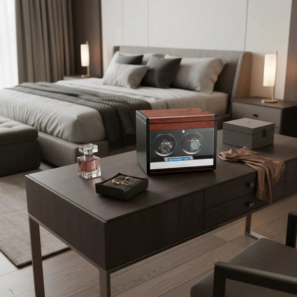 A modern bedroom with a large bed, two bedside lamps, and a wooden desk. On the desk are an Aevitas 2 Watch Winder with Extra Storage Wood Veneer Finish holding two watches, a perfume bottle, an open jewelry box, and a closed gray storage box.