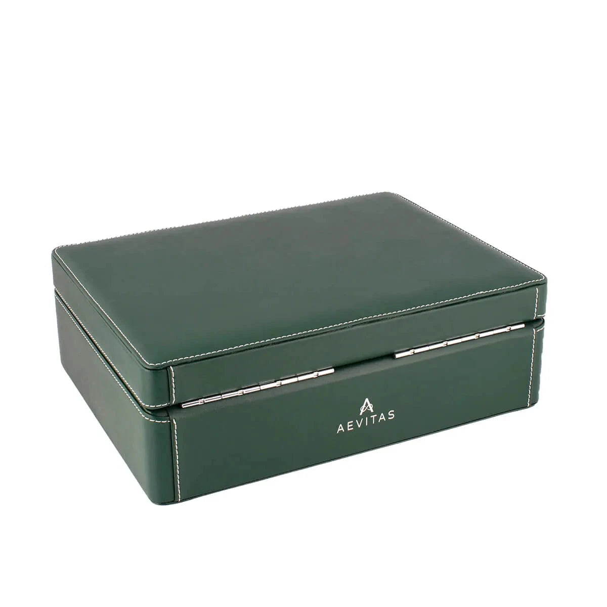 The Aevitas 8 Watch Box in Green Leather Finish features fine quality vegan leather, white stitching, a metal hinge, and the Aevitas logo—an elegant storage solution for your treasured timepieces.