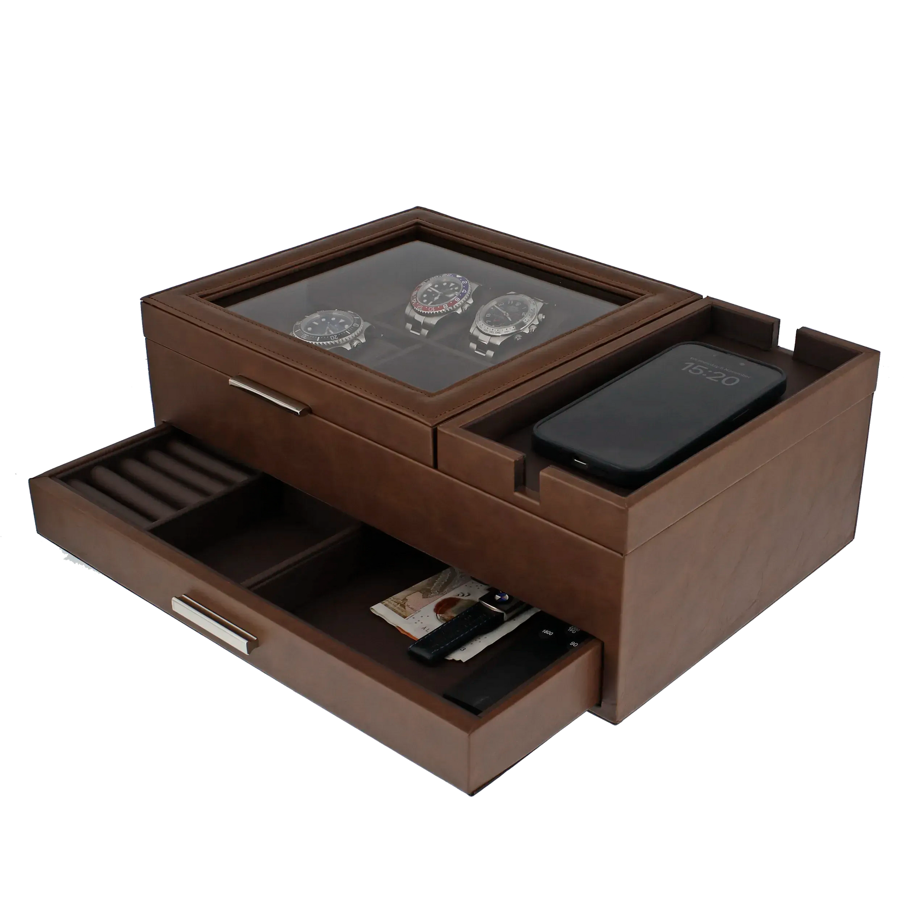 The Aevitas Men's Large Brown Valet Tray features 8 watch holders, two drawers, a glass lid displaying three watches, and a groove on the right for a smartphone.