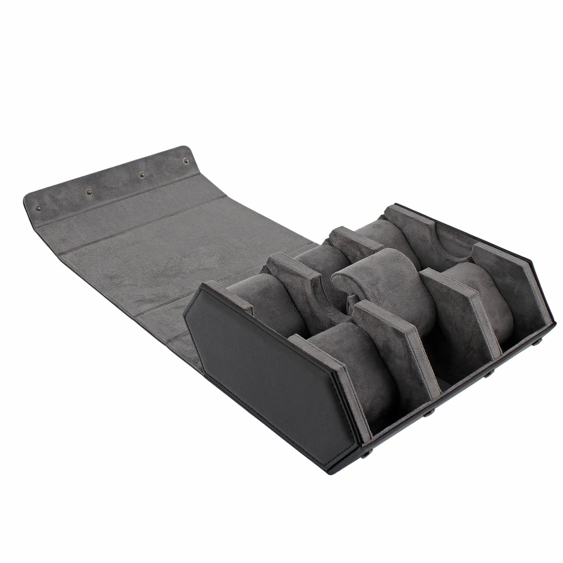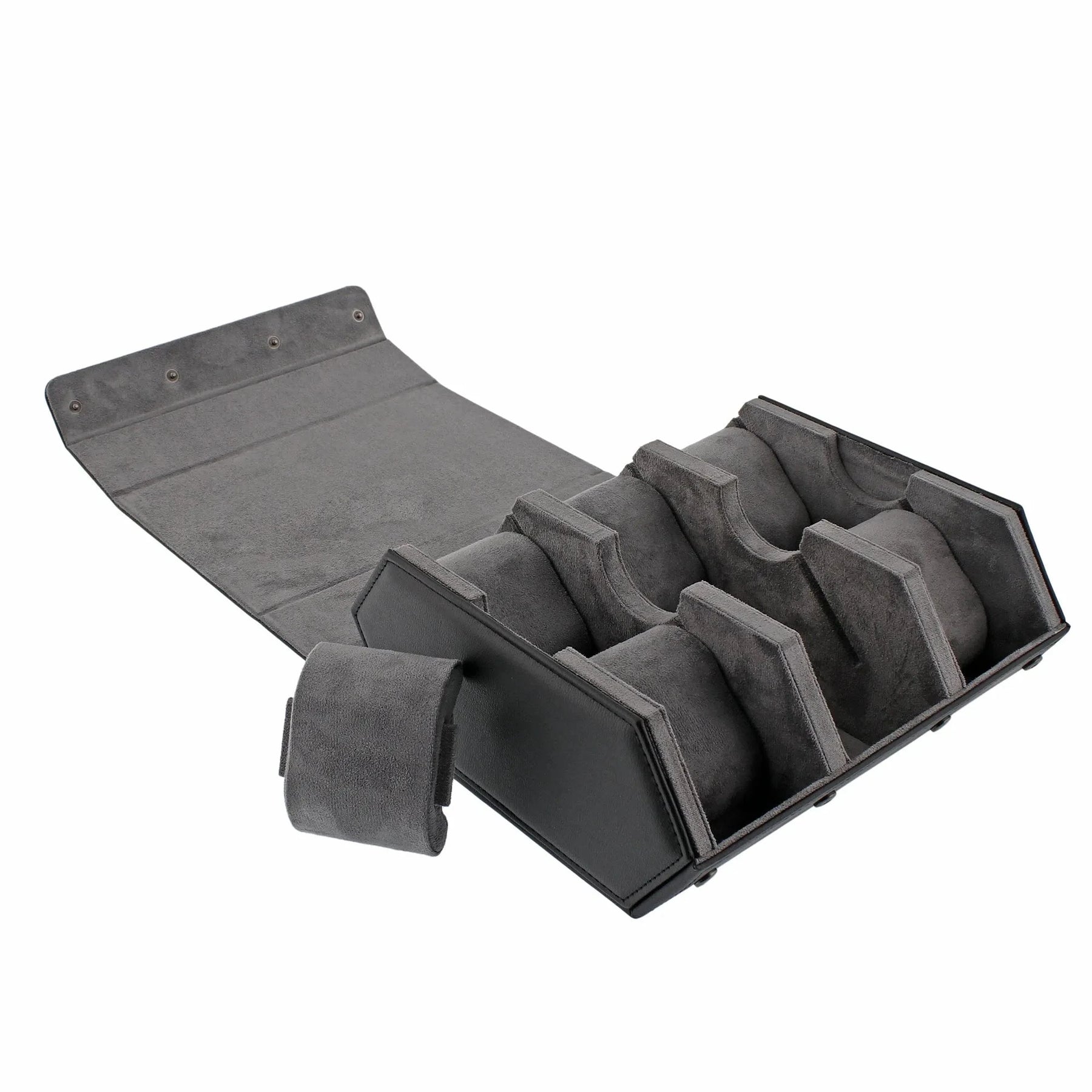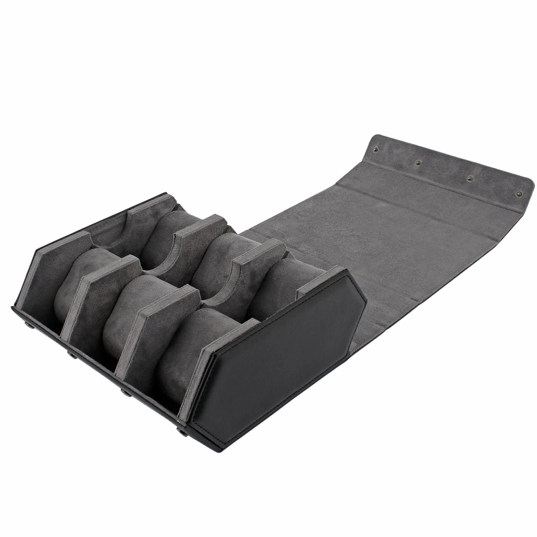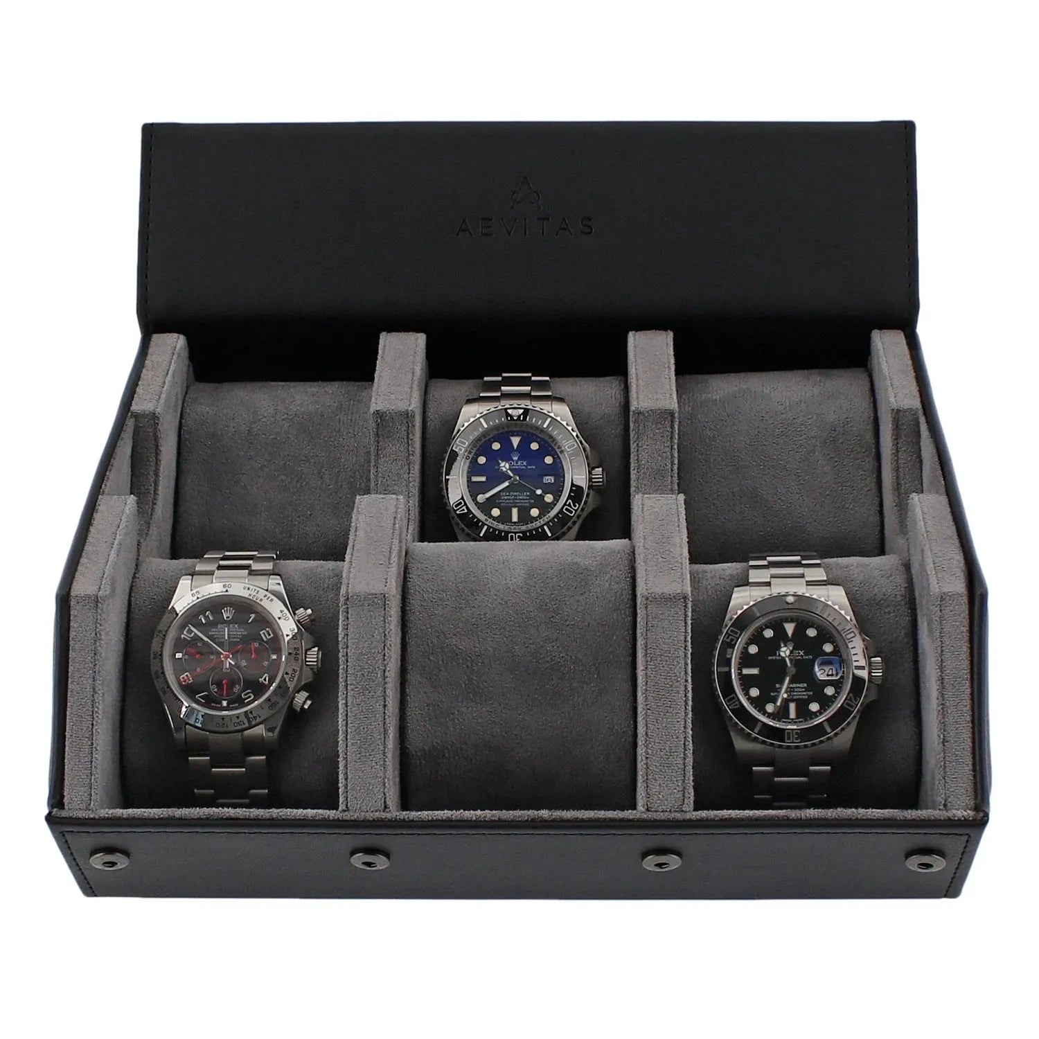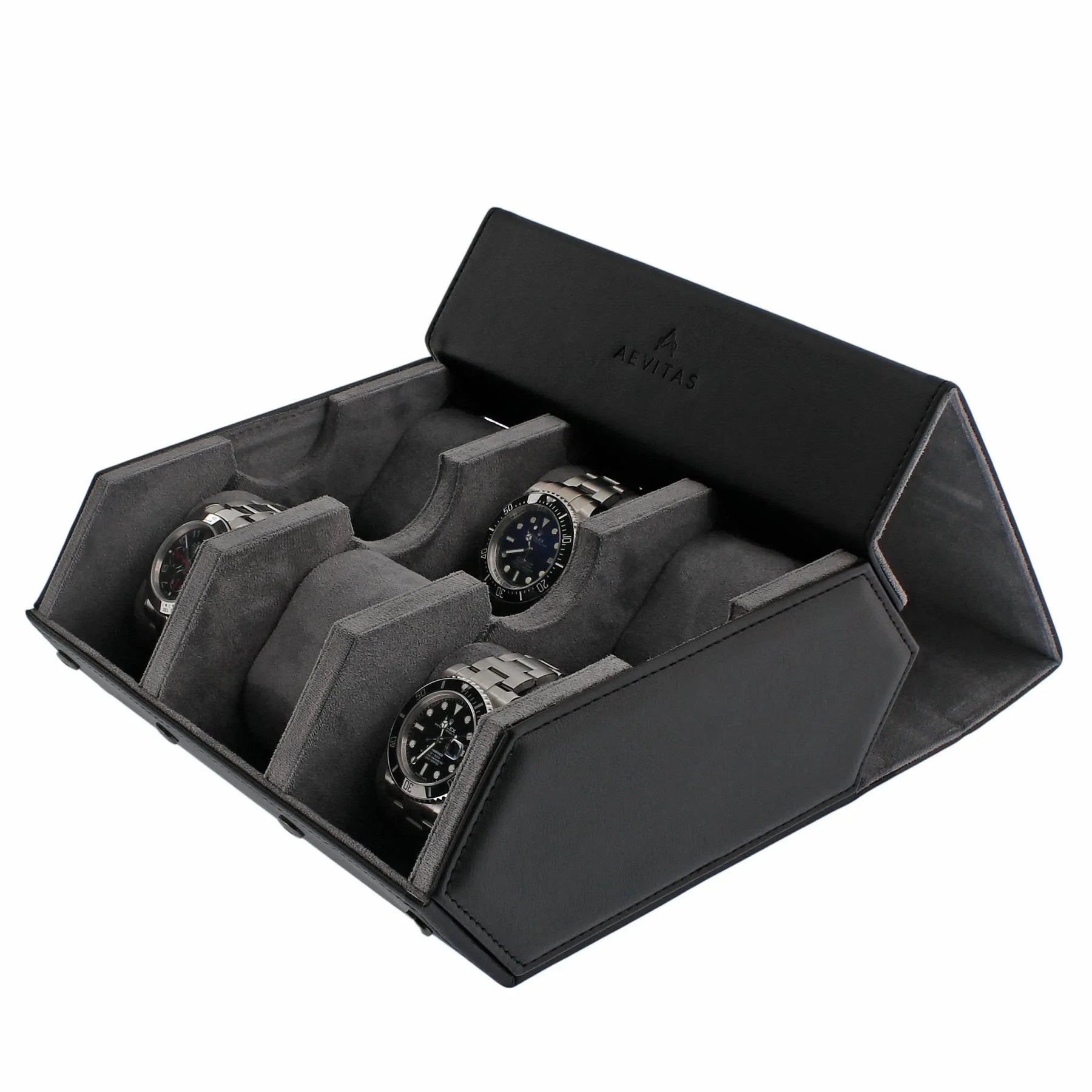 Travel securely with the 6 Watch Travel Case in Black with Grey Lining Hexagon Style by Aevitas. Made from top-quality vegan leather, this stylish case offers a plush suedette interior that protects your watches from damage. Perfect for wrist sizes between 16 and 20 cm.