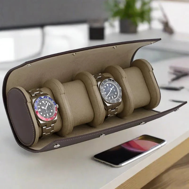 حافظة الساعة الرباعية المثالية لأولئك الذين يطلبون أفضل جودة لتخزين الساعات الفاخرة أثناء السفر. تم تصنيعها يدويًا بخبرة باستخدام مواد رائعة، جلد عجل إيطالي حقيقي مع بطانة ألكانتارا.