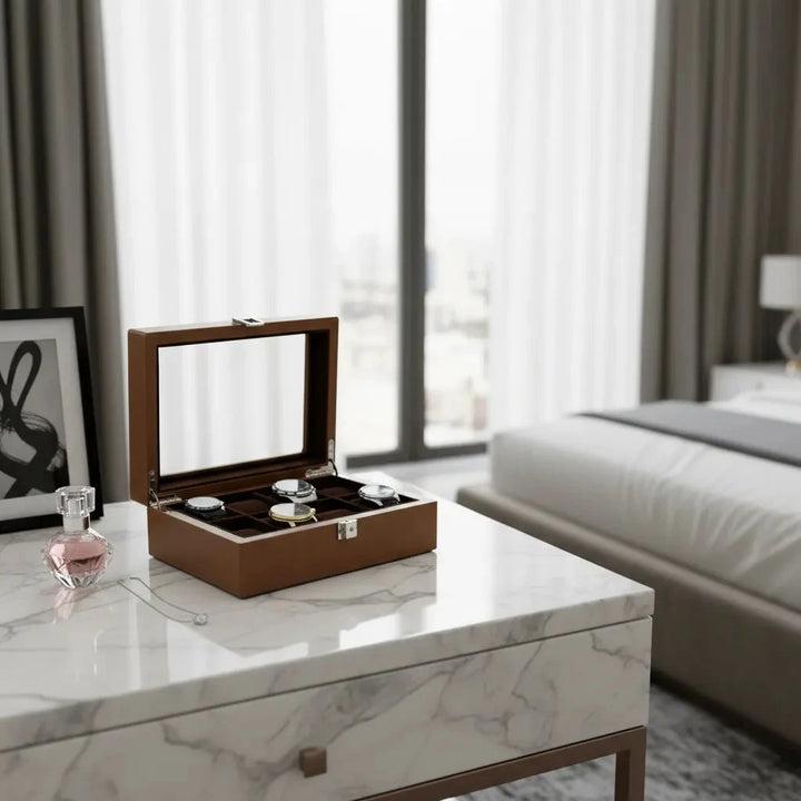 صندوق الساعات 8 ببطانة مخملية من الجلد الطبيعي باللون البني الكونياك من Aevitas هو صندوق ساعات فاخر وفائق الجودة. مصنوع من جلد بني كونياك أصلي، ويتميز ببطانة مخملية بلون الشوكولاتة وغطاء زجاجي يمكن الرؤية من خلاله مع زر ضغط. تضيف تركيبات الكروم مظهرًا كلاسيكيًا عصريًا، كما أن الصندوق قابل للقفل لمزيد من الأمان. يمكنها حمل ما يصل إلى 8 ساعات معصم، مع وسادة ناعمة وثابتة. يبلغ حجم الصندوق 24.6 × 19 × 9.2 سم، ويتسع لساعات يصل عرضها إلى 50 ملم. كما يأتي مع صندوق هدايا عالي الجودة.