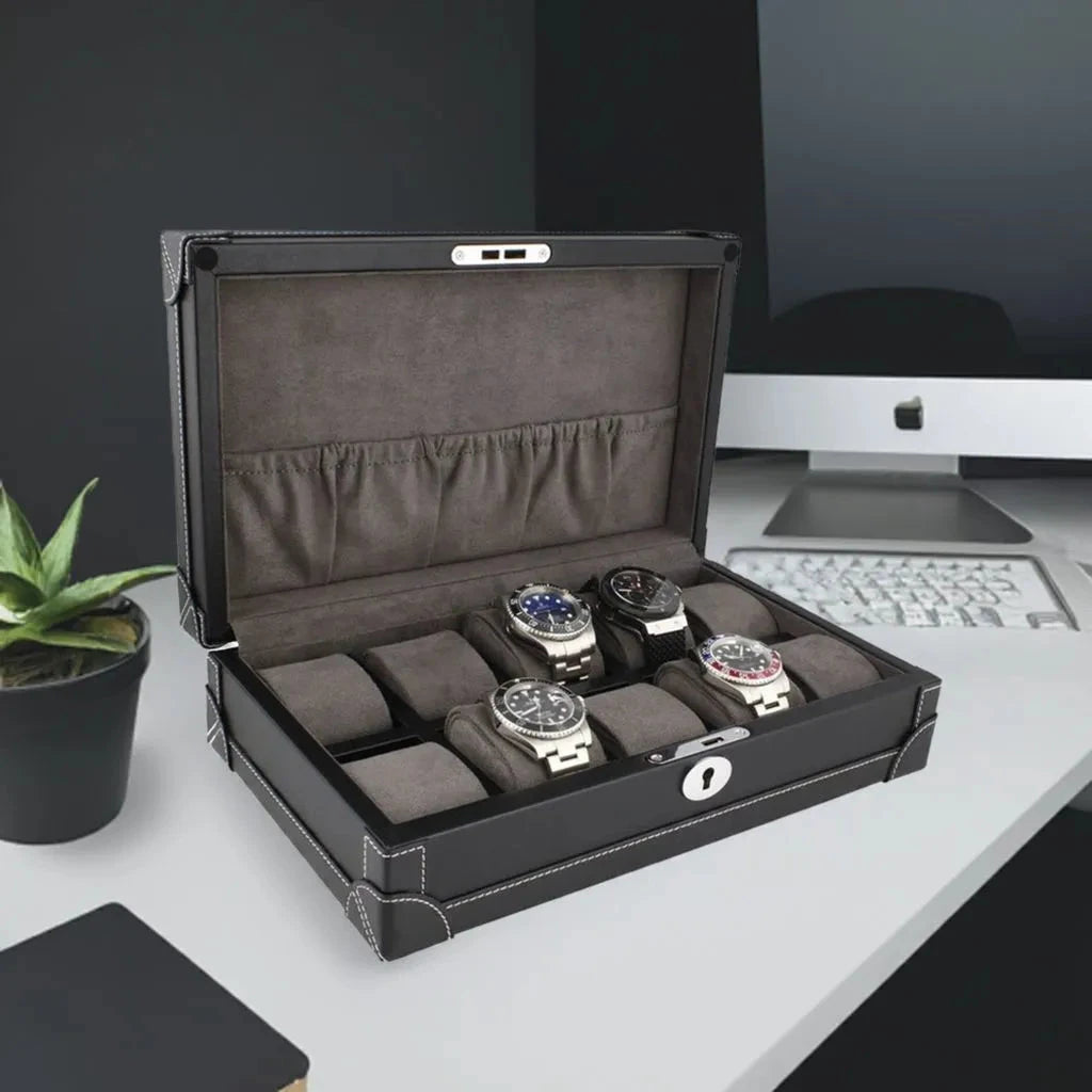 The Aevitas 10 Watch Box in Black Vegan Leather features white stitching, plush gray lining, cushioned slots for ten watches, and extra storage in the lid—combining stylish design and practical organization.