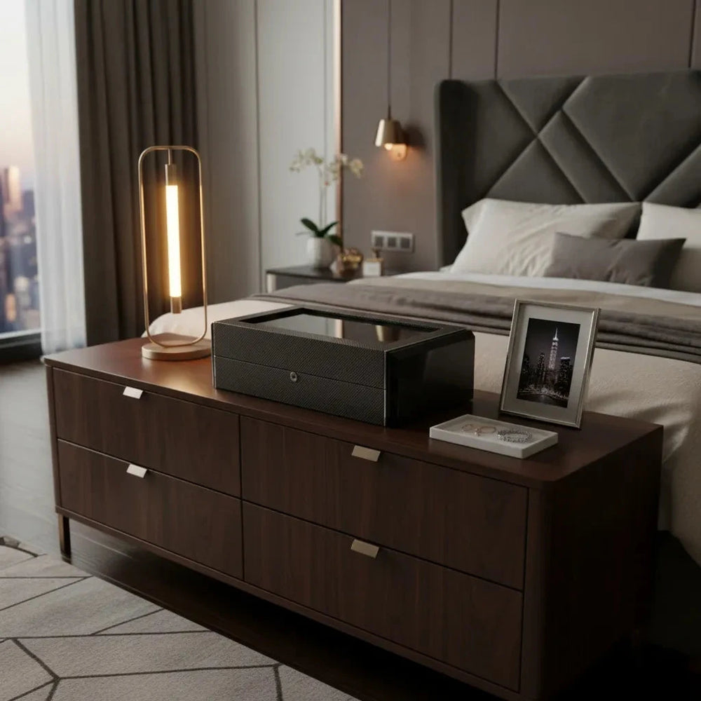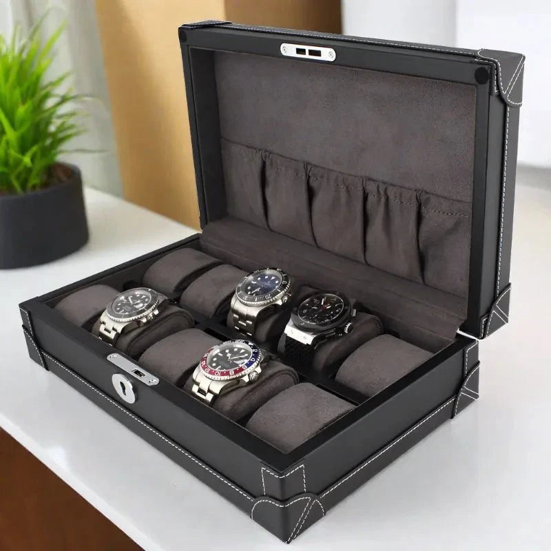 10 Uhrenbox in schwarzem veganem Leder mit Plüschfutter