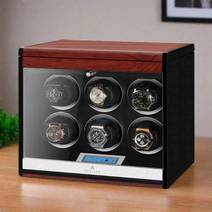 The Aevitas 6 Watch Winder with Extra Storage features a wood veneer finish, glass door, digital controls, and rotates six large watches—combining style and function for premium timepiece care.