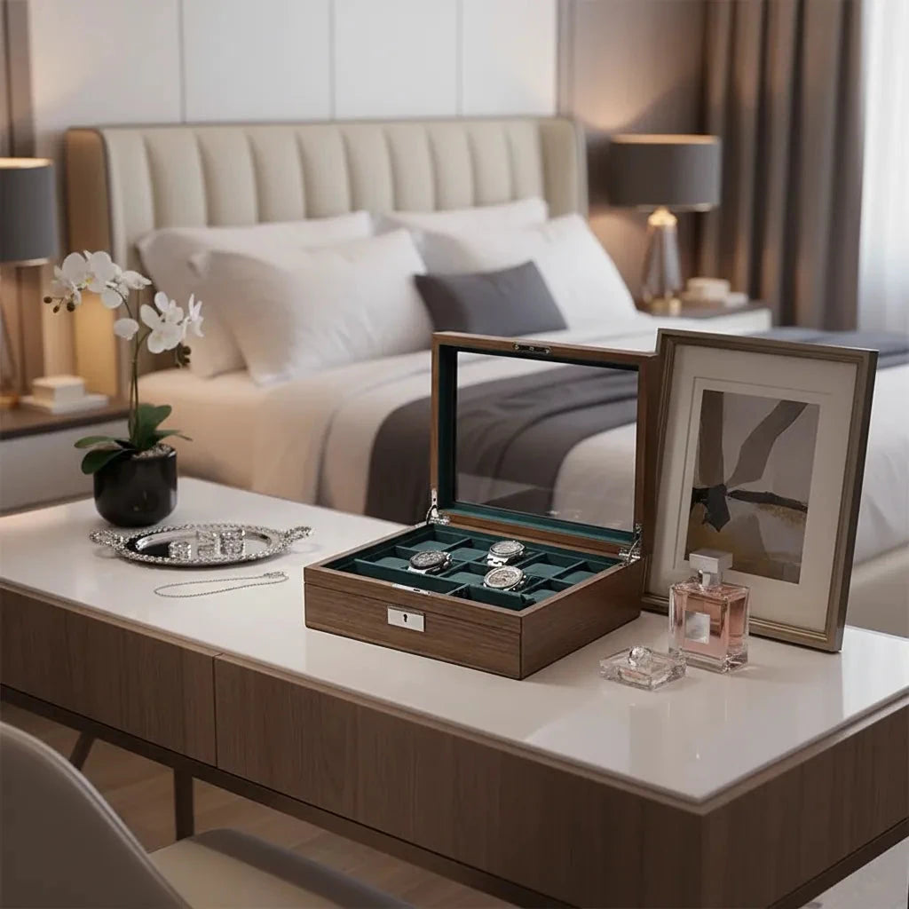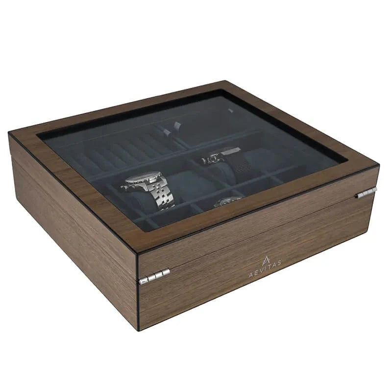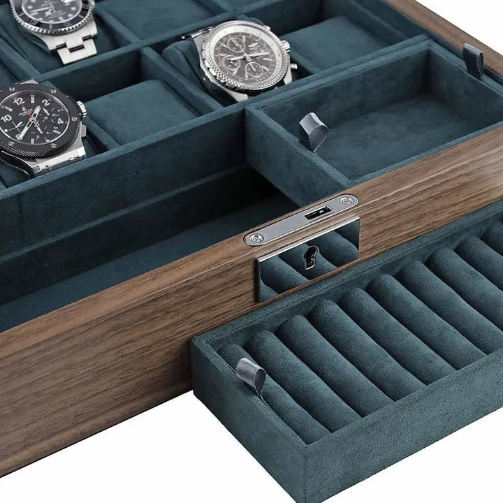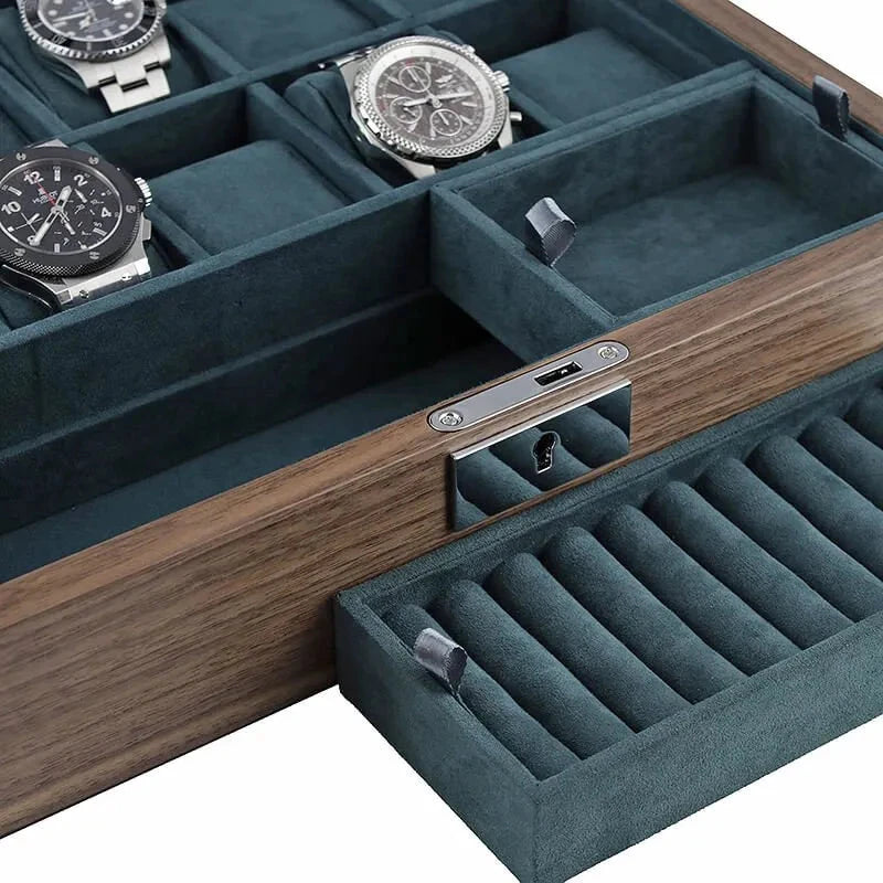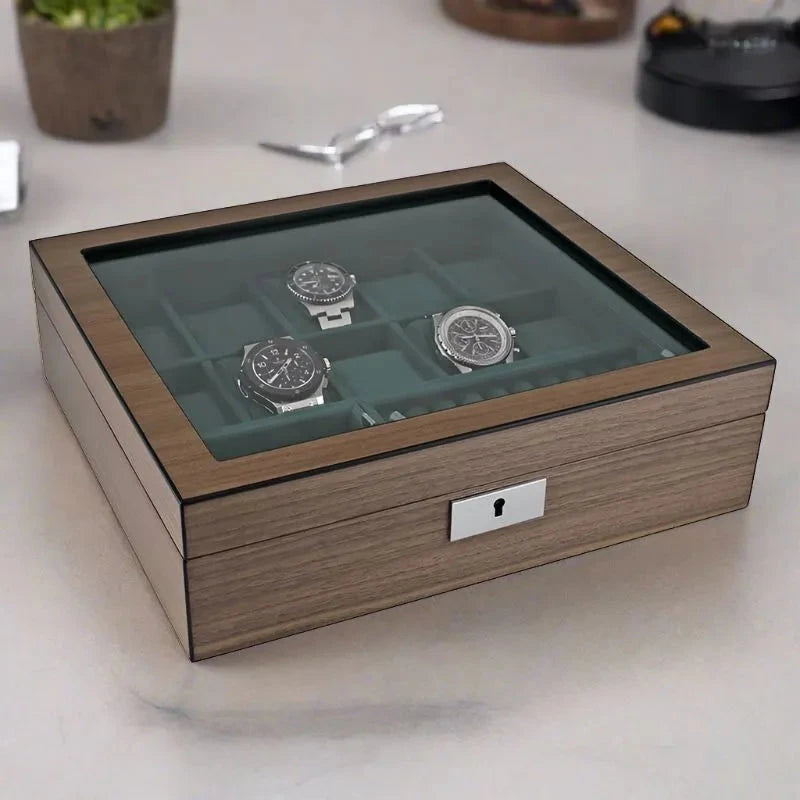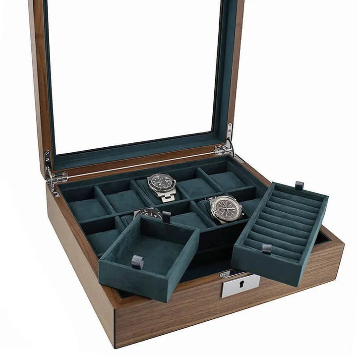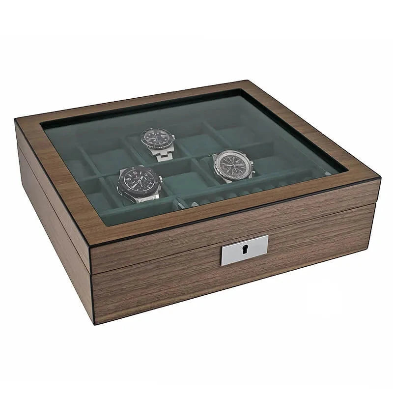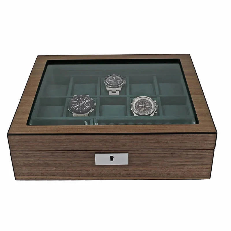 Our New 10 Watch Box with Cufflink Storage in Natural Walnut Finish is perfect for storing your watches and cufflinks. Luxury soft green suede like interior really shows your treasure off. The exterior is natural walnut finish for that touch of class.