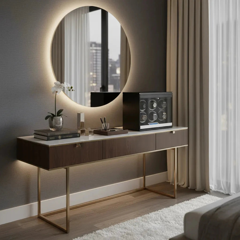 A modern console table with a gold frame displays books, a potted orchid, and the Aevitas 6 Watch Winder in Carbon Fibre with Extra Storage Area. A large round backlit mirror hangs above, with tall curtains framing a city-view window.