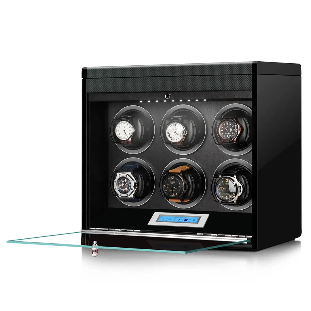 The Aevitas 6 Watch Winder in Carbon Fibre features black and silver styling, a glass front, digital controls, individual rotating holders for six watches, and an extra storage area—ideal for automatic timepieces.