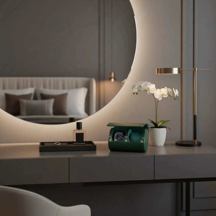 Parfaitement adapté aux poignets de taille moyenne entre 16 cm jusqu'à 19 cm ou 6 1/2 pouces à 7 1/2 pouces et hOlds regarde jusqu'à 60 mm de large. Montré avec une montres Rolex (non incluse).