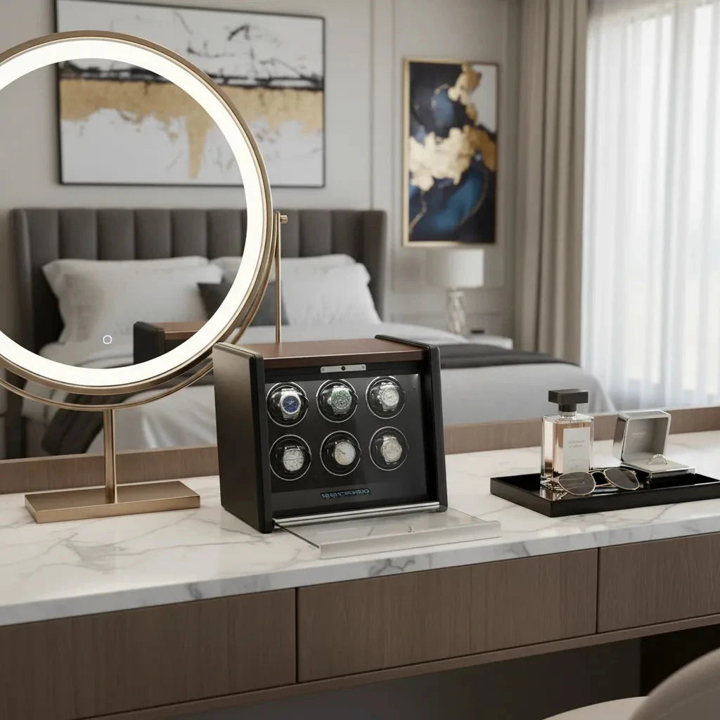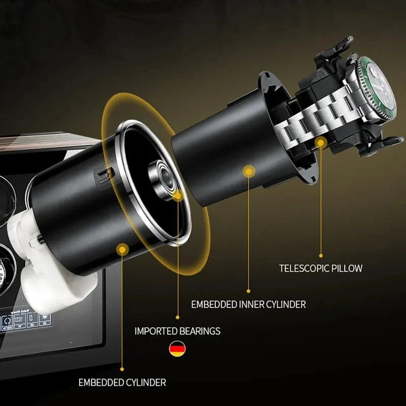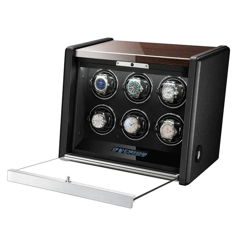 Perfection du chronométrage en mouvement: Élevez votre collection de montres automatique avec Aevitas Premium 6 Watch Winder, propulsé par le moteur allemand de précision et magnifiquement conçu dans la laque de piano en bois noyer foncé.