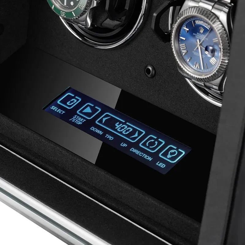 Ces enroulements de montre enrouleront n'importe quelle montre automatique, les virages par jour sont de 300 à 2200 réglés par 100 incréments dans l'une ou les deux directions. Chaque rotor peut être réglé et contrôlé individuellement. Ceci est parfait pour 100% des marques de montres automatiques. Ces enroulements de montre ne serviront jamais votre montre, il termine son programme d'enroulement intermittent pendant une période de 24 heures, puis recommence le lendemain, permettant à votre montre de fonctionner en permanence et le vent prêt pour la prochaine fois que vous voulez le porter, pas de réinitialisation requis. Imitant parfaitement un enroulement naturel pendant votre poignet. L'intérieur en peluche est fini en microfibre foncé avec du métal chromé contrasté. Pleinement utilisable pour une vie exceptionnellement longue. Secteur alimenté. Garantie de 3 ans. Taille 37W x 24d x 31h cm