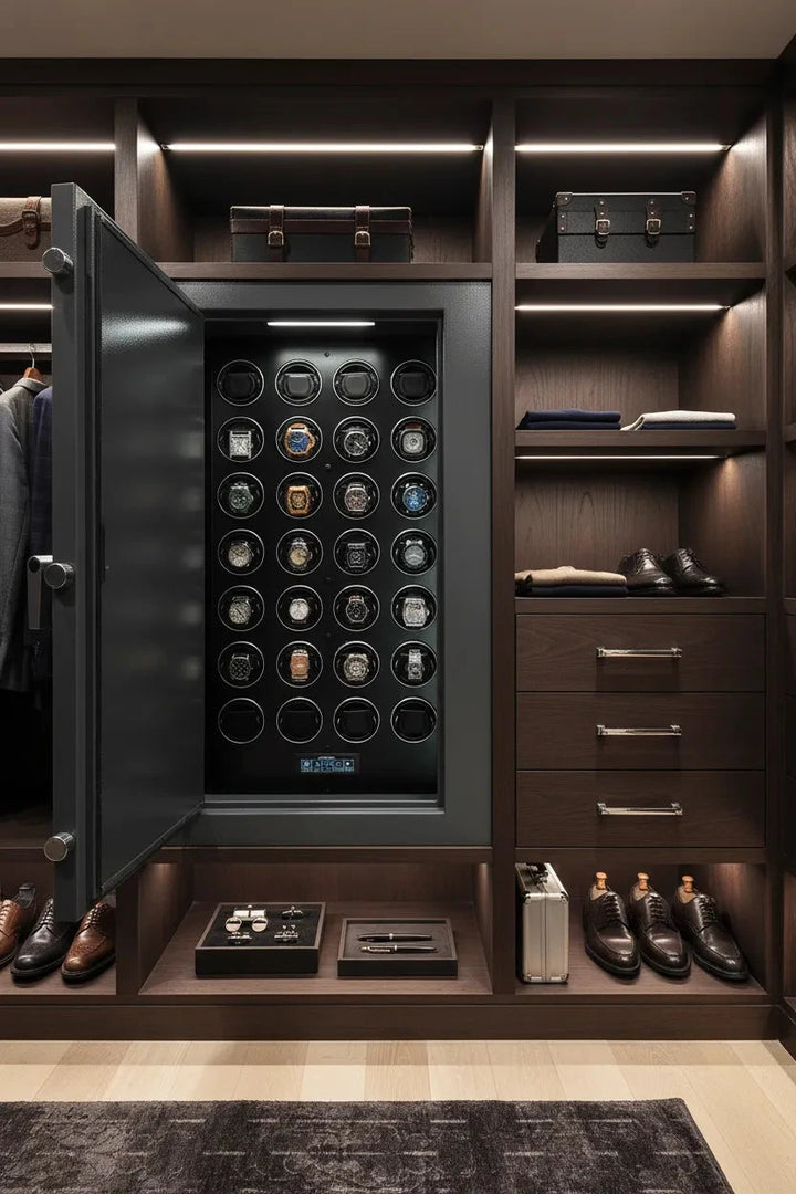 L'avvolgitore di orologi è completamente programmabile su ciascun rotore di orologio, con 650, 900, 1350, 1800 o 2200 giri al giorno in una o entrambe le direzioni. L'esterno è rivestito in polvere e la luce LED interna è completamente controllabile dal telecomando. Come mostrato nella seconda immagine ma senza lo spazio extra o i cassetti, solo 24 avvolgitori di orologi all'interno della cassaforte.