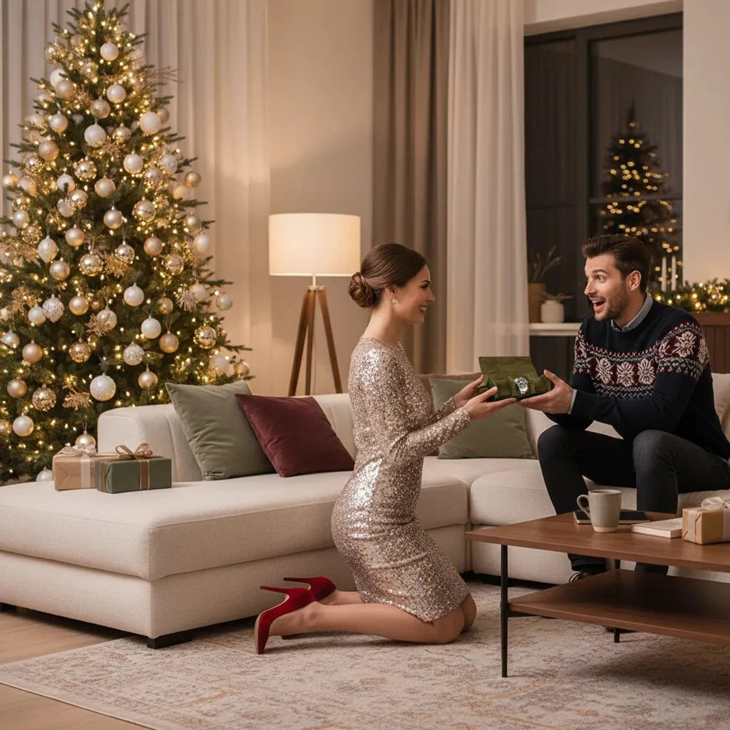 A woman in a sparkly dress gifts an Aevitas 3 Watch Roll Case, Hexagon Style in Black Nappa Leather, to a smiling man by the Christmas tree, adding elegance and joy to their festive celebration.