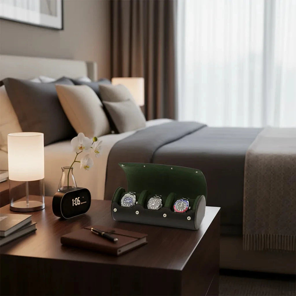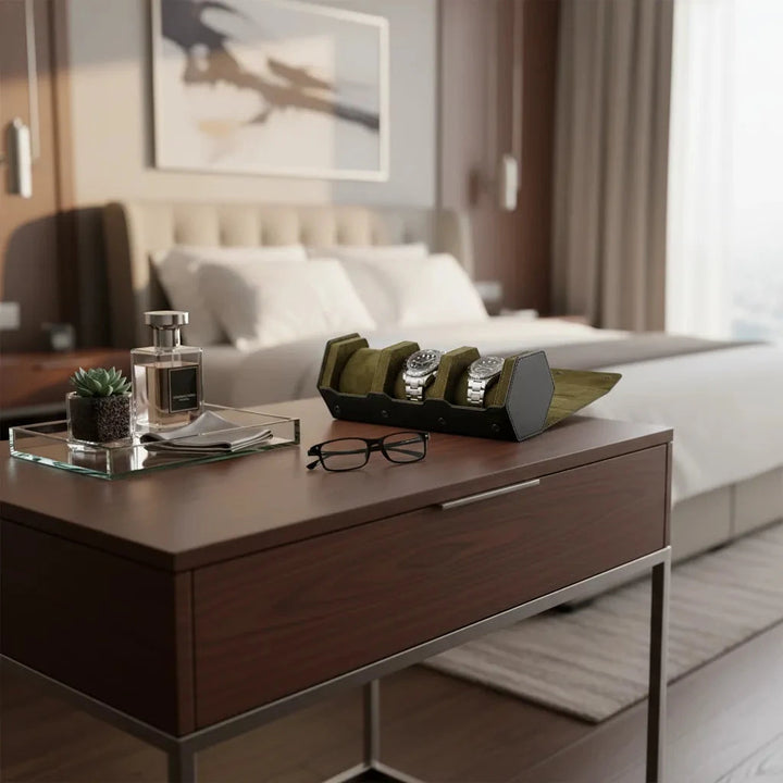 A modern bedroom with a wooden nightstand holds a tray featuring a perfume bottle, potted succulent, eyeglasses, and the Aevitas 3 Watch Roll Case Hexagon Style in Fine Black Nappa Leather displaying three watches; neat bed and art in the background.