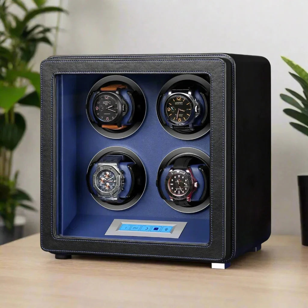 4 orologi avvolgitore con finitura in pettinatura nera. Questo avvolgitore di eavitas è quello di cui hai bisogno! Il nostro supporto per orologio brevettato è abbastanza grande per le dimensioni del polso più grandi degli uomini, ma abbastanza versatile da mettere orologi di dimensioni del polso più piccole. Perfetto per quegli orologi per il viso davvero grandi fino a 70 mm di larghezza e guidati dai nostri ultimi motori tedeschi.