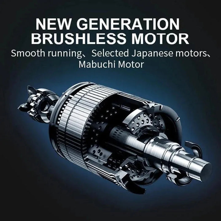 A digital graphic features a metallic brushless motor spotlighted against a dark background with text: “NEW GENERATION BRUSHLESS MOTOR. Smooth running. Selected Japanese Mabuchi Motor.” Ideal for the Aevitas 8 Watch Winder with Extra Storage Wood Veneer Finish.
