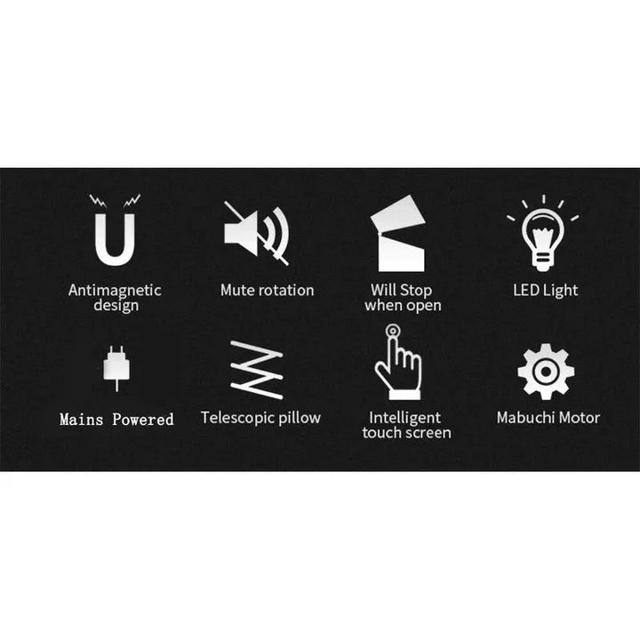 The Aevitas 8 Watch Winder with Extra Storage features a sleek black background with eight white icons and labels for antimagnetic design, mute rotation, stop on open, LED light, mains power, telescopic pillow, touchscreen, and Mabuchi motor.