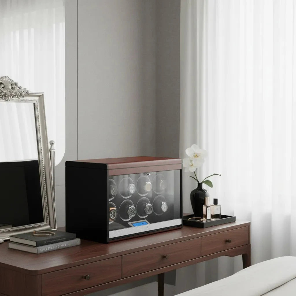 The Aevitas 8 Watch Winder with Extra Storage features a sleek wood veneer finish, glass door, and digital controls—an elegant solution to display and protect your watch collection.
