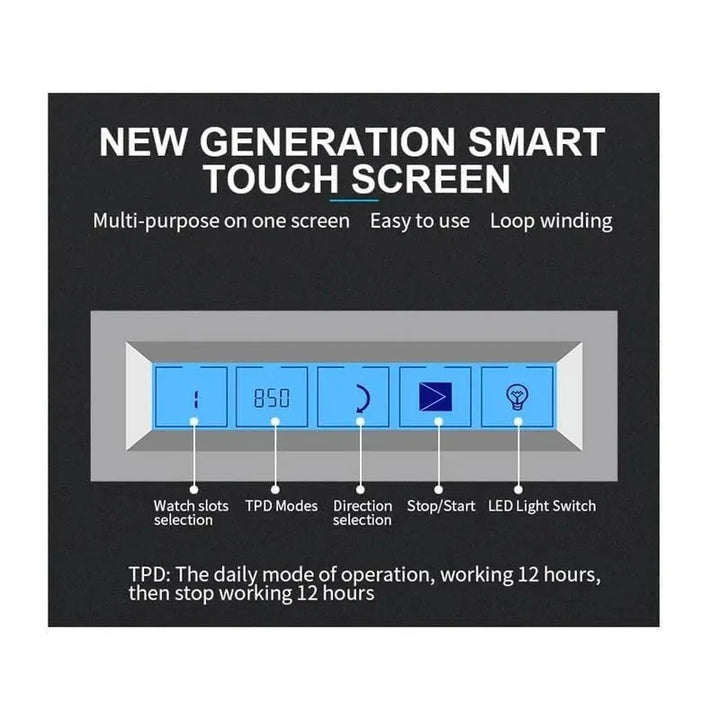 The Aevitas 8 Watch Winder with Extra Storage features a smart touchscreen and five blue buttons—Watch Slots, TPD Modes, Direction, Stop/Start, LED Light—for easy control of your timepieces. Wood veneer finish adds style.