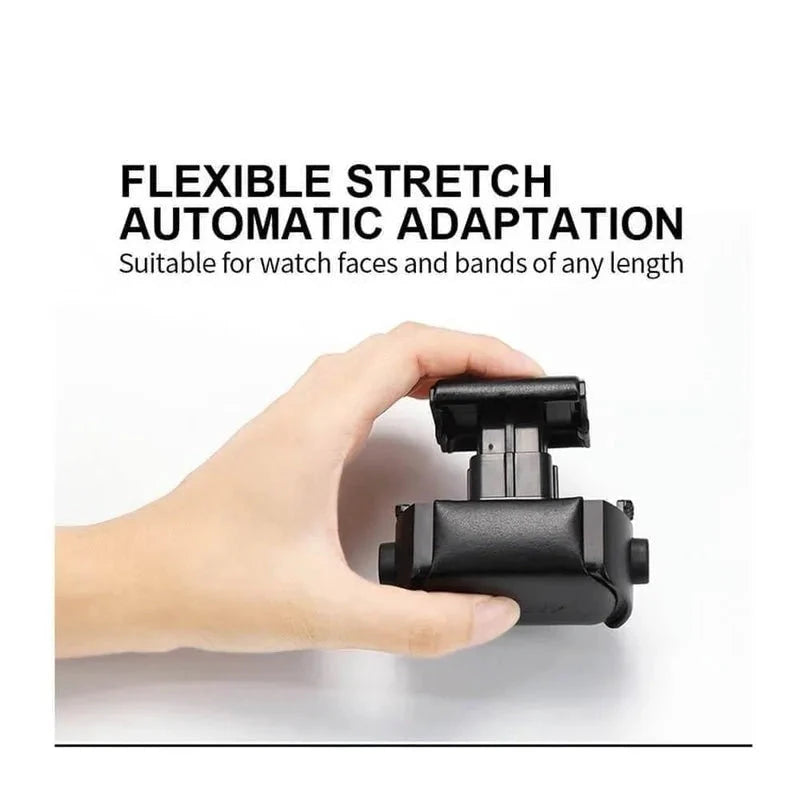 A hand holds a black adjustable device, an accessory for the Aevitas 8 Watch Winder with Extra Storage Wood Veneer Finish, under text reading "Flexible Stretch Automatic Adaptation." Fits watch faces and bands of any length.