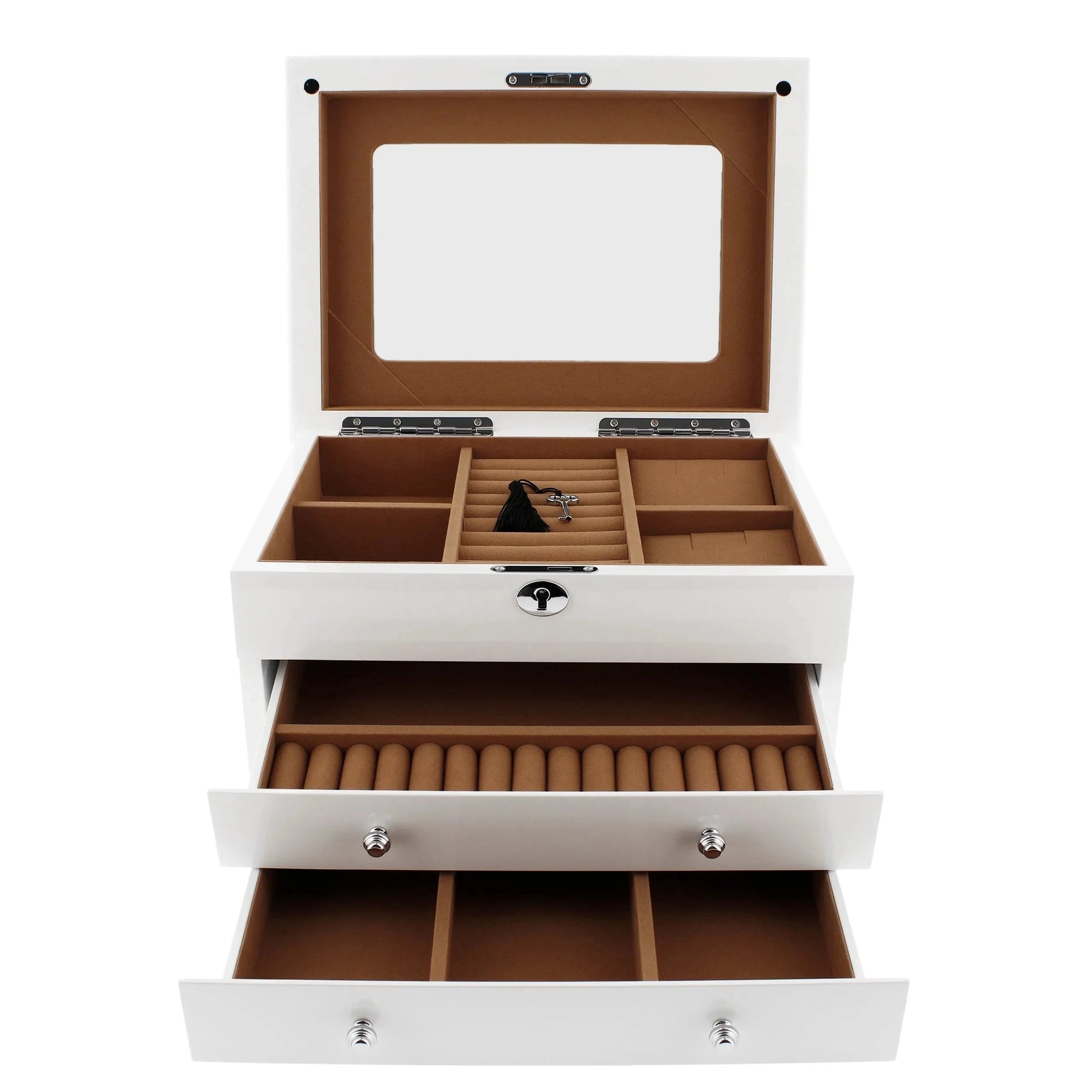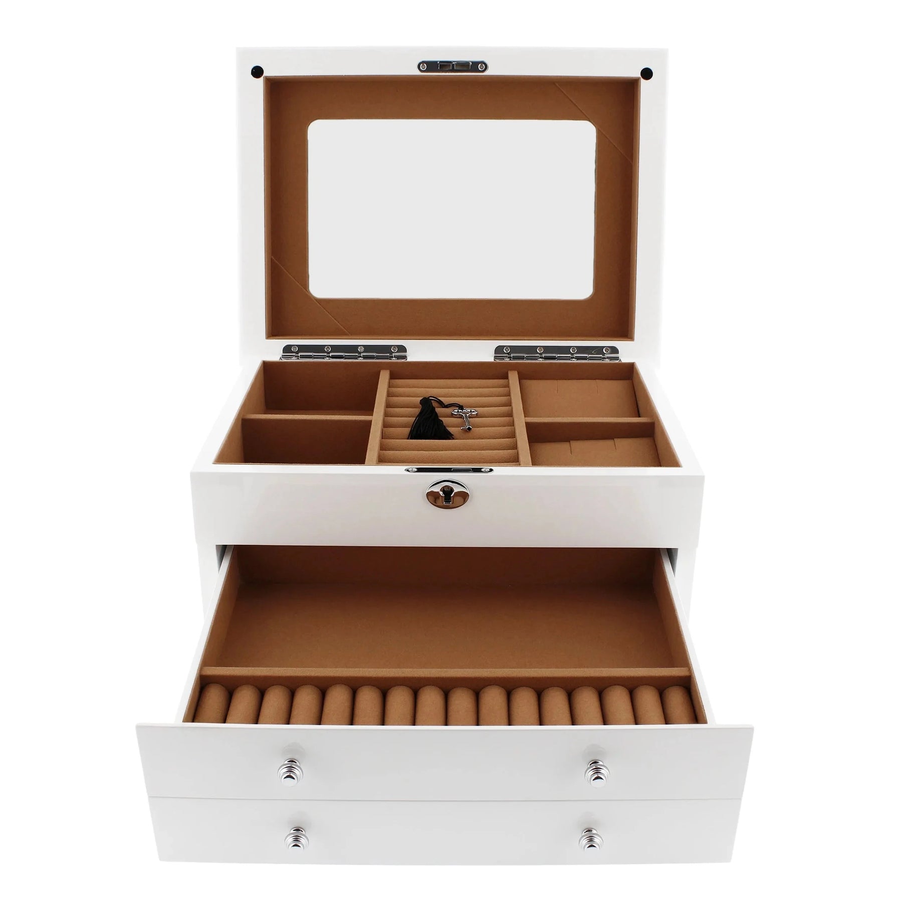 The Extra Large Premium Jewellery Box by Aevitas Watch Winders features glossy white wood, a hinged lid with mirror, camel colour lining, ring rolls, keys, multiple compartments, and two pull-out drawers with round knobs.