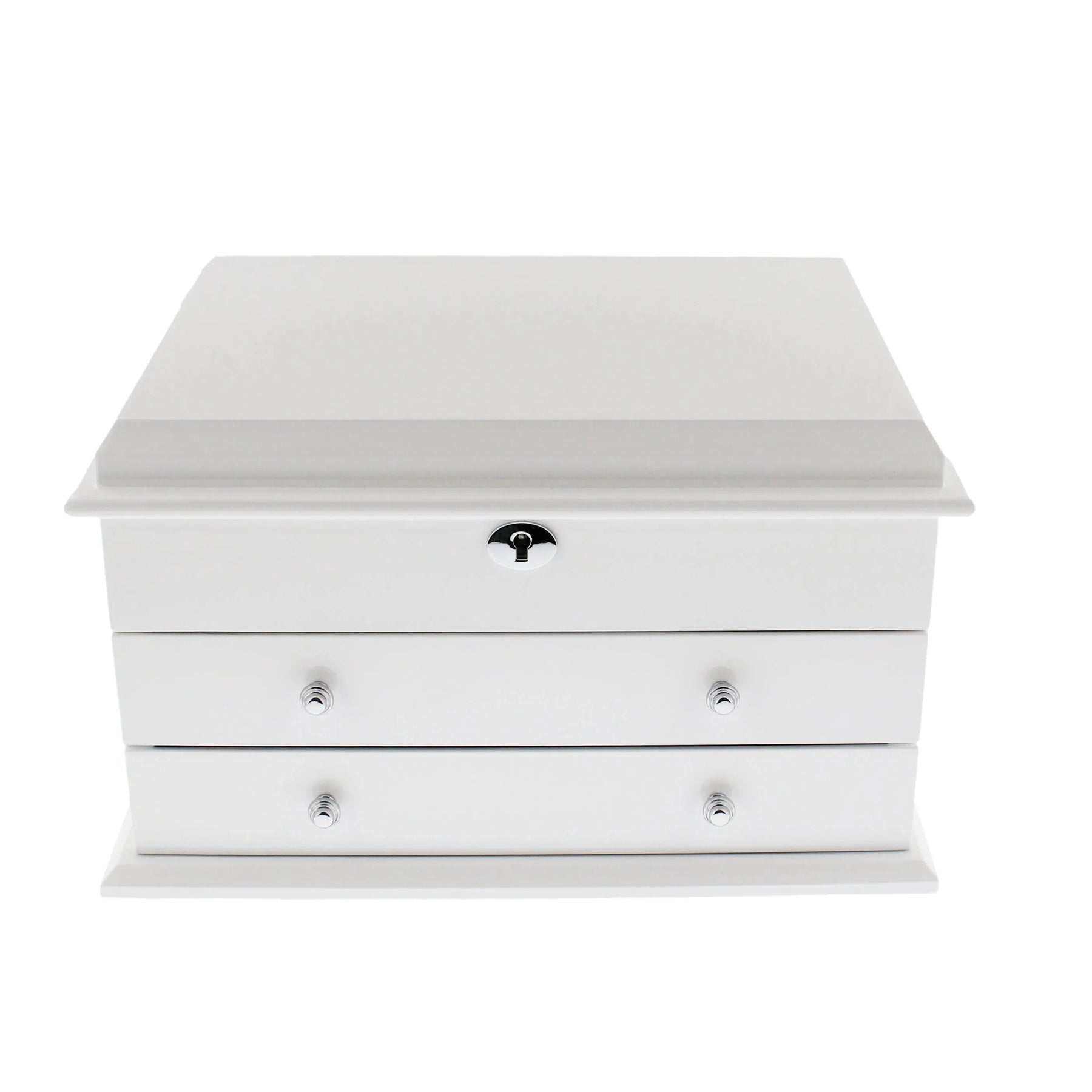 The Extra Large Premium Jewellery Box in white wood by Aevitas Watch Winders features two drawers, camel-coloured lining, dedicated ring section, secure front lock, and includes a key with black tassel for elegant jewellery storage.