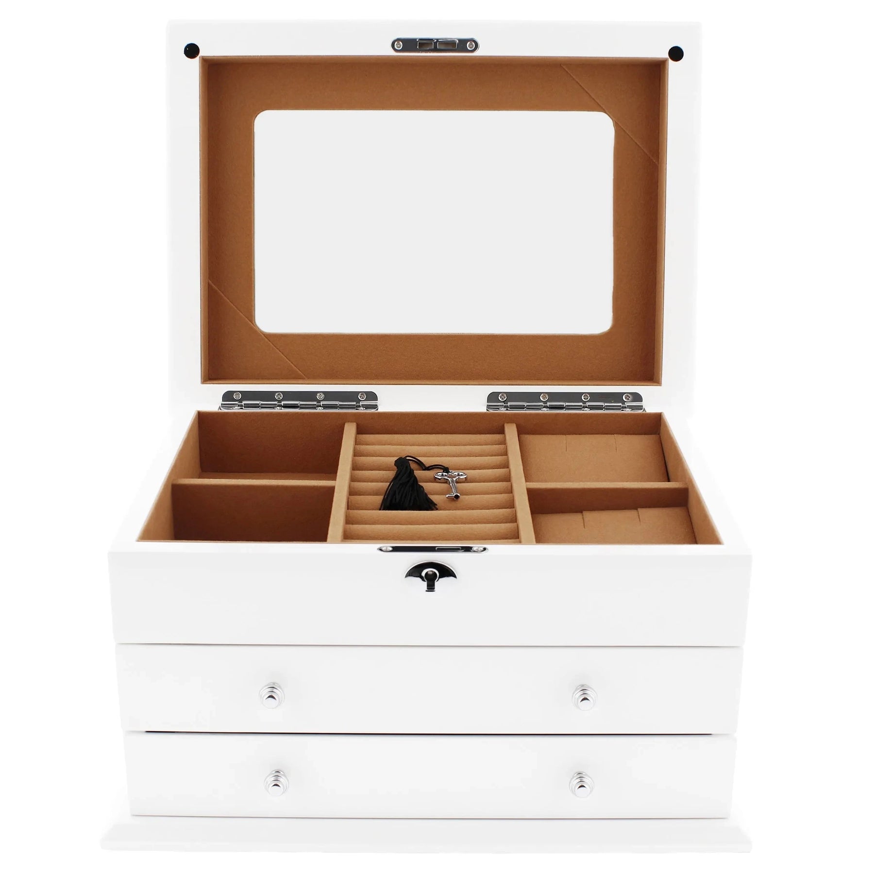The Extra Large Premium Jewellery Box White Wood with Camel Colour Lining by Aevitas features a hinged lid with mirror, multiple top compartments, lock and key, and an open lower drawer with three sections for elegant jewellery storage.