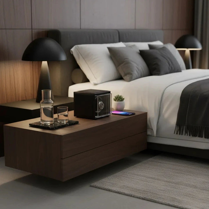 A modern bedroom features a bed with white linens and gray pillows, a floating wooden nightstand holding an Aevitas Single Watch Winder in black leather with red stitching, a lamp, glass carafe set, small safe, plant, smartphone, all on a neutral rug.