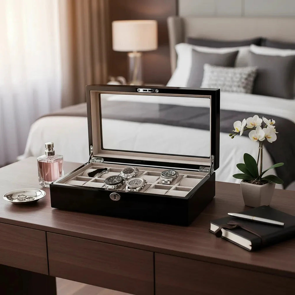 La nostra migliore qualità e il miglior design, questa scatola da 12 orologi in finitura in legno di burl scuro è semplicemente perfetta. Terrà ordinatamente fino a 12 orologi da polso nel cuscino morbido ma fermo nella posizione che li imposti.