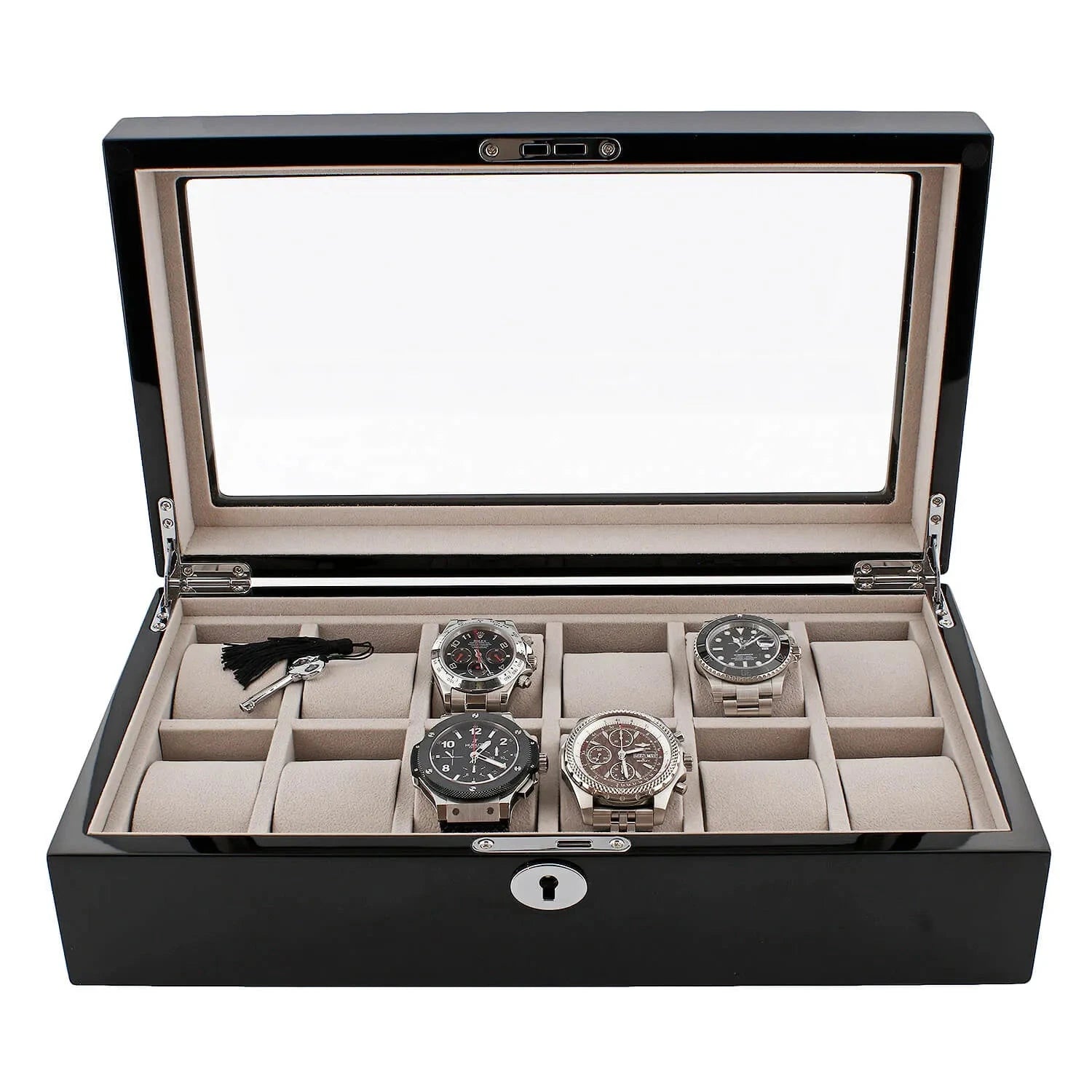 12 Watch Box in Piano Black Gloss Finish with Grey Luxury Lining by Aevitas