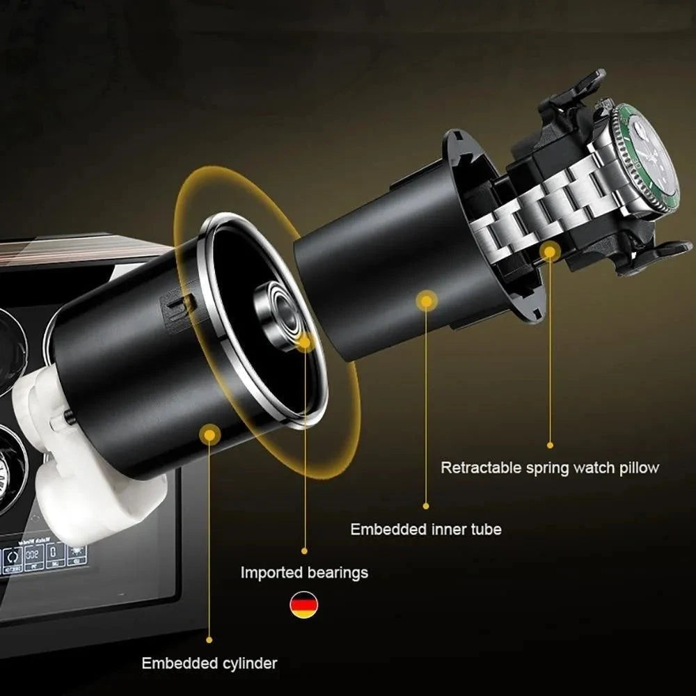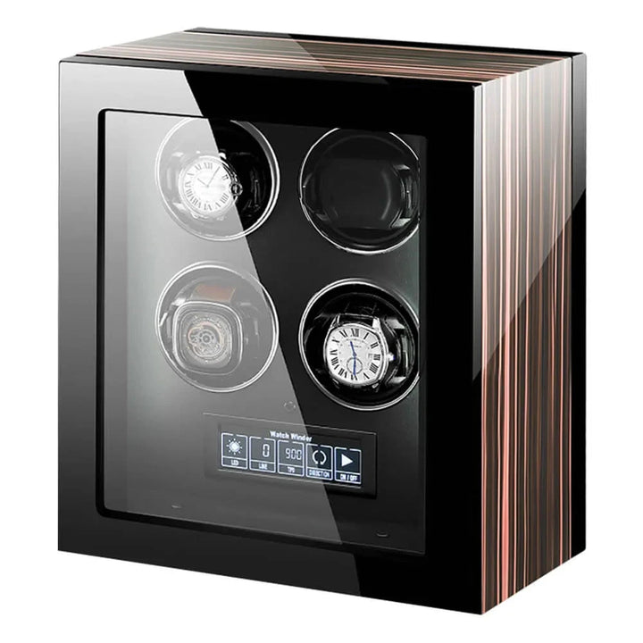 Premium Quality Luxury Aevitas Automatic 4 Watch Winder with Touch Screen. Finished in High Lacquer Piano Veneer Ebony Wood Finish. One of the Finest Four Watch Winders available with Touch Screen and New Near Silent Brushless long life German motor technology.